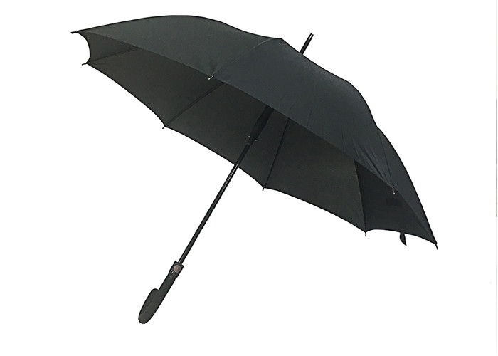Ombrello da golf promozionale nero di alta qualità con tessuto pongee resistente e struttura rinforzata in fibra di vetro per una resistenza superiore al vento.
